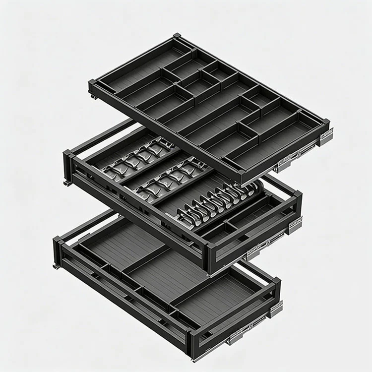 4. Aplikasi Utama:Menyelesaikan masalah storan dalaman yang tidak kemas dalam kabinet dapur, membolehkan penempatan pinggan mangkuk dan peralatan dapur yang lebih teratur. Pemasangan terbenam tidak menempati ruang meja dapur, meningkatkan kebersihan keseluruhan dan kecekapan penggunaan dapur.