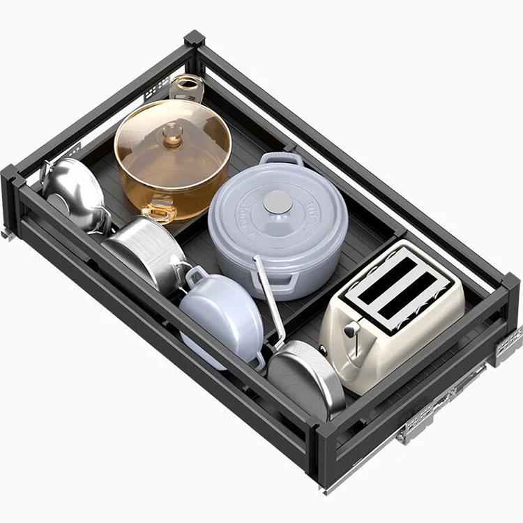 Bakul tarik keluar aloi aluminium ini ialah perkakasan penyimpanan dapur terbenam, terutamanya digunakan untuk penyimpanan terperingkat barangan dapur seperti pinggan mangkuk, periuk dan perasa. Laci kabinet dapur ini ialah penyelesaian penyimpanan terbenam yang direka khas untuk dapur moden. Dengan reka bentuk berlapis dan fungsi praktikal pada terasnya, ia dengan mudah menyelesaikan masalah storan dalaman yang tidak kemas dan penggunaan ruang yang rendah dalam kabinet, dan merupakan pembantu yang sangat baik untuk penyimpanan dapur.