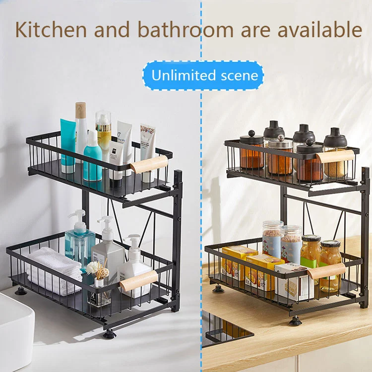 2. Menambah aksesori untuk meningkatkan tekstur: Pereka bentuk kami telah menambah pemegang kayu sebagai aksesori untuk menjadikan keseluruhan produk lebih menarik. Apabila ditarik, ia mempunyai rasa yang menyenangkan, dan kertas pelapik tambahan ditambah ke bahagian bawah bakul untuk mengelakkan barang-barang kecil daripada tergelincir. Ketinggian tapak kaki juga boleh dilaraskan. Jika digunakan di dalam bilik mandi, tidak perlu risau tentang barang yang diletakkan bersentuhan dengan air di atas meja.