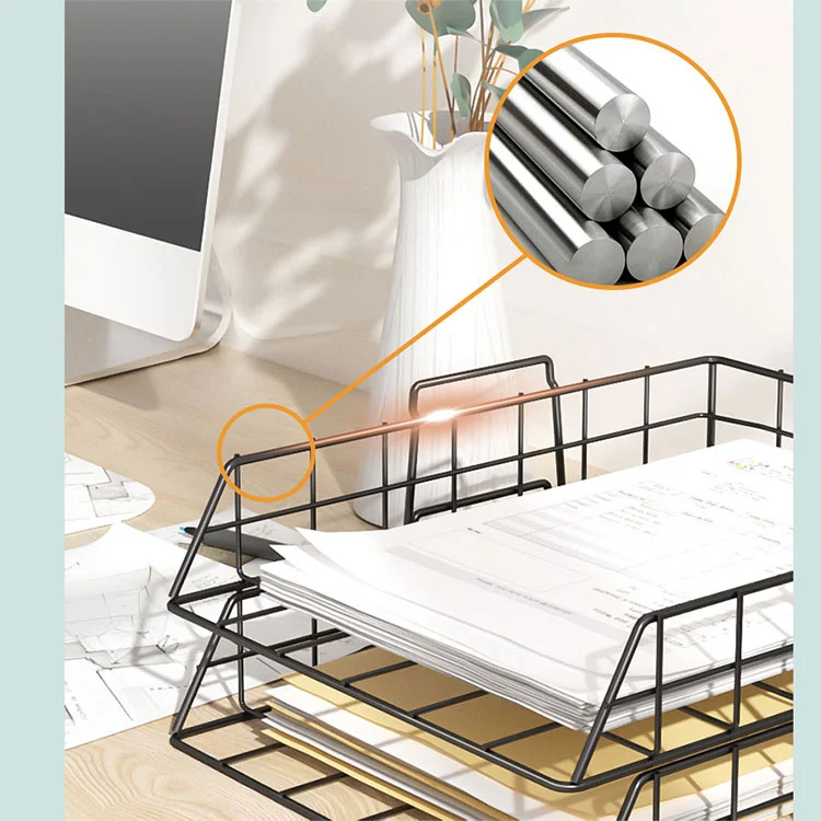 Nota: Bahagian bawah rak penyimpanan fail dulang logam telah dilicinkan, jadi ia tidak akan mencalarkan bahagian atas meja. Walau bagaimanapun, kami mengesyorkan menggunakan pad anti-gelincir atau alas meja apabila meletakkannya di atas permukaan yang berharga.