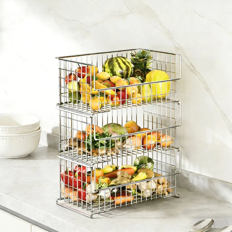 Senario penggunaan: Ia boleh diletakkan di sudut dapur atau di bawah meja, membolehkan penyimpanan berlapis-lapis sayur-sayuran, buah-buahan, makanan ringan, beras, tepung, dsb., mencapai "penyimpanan visual" dan membolehkan anda mencari item yang anda perlukan sepintas lalu, menghilangkan kerumitan menyelongkar kabinet. Reka bentuk susun berbilang lapisan boleh menggunakan sepenuhnya ruang menegak, membolehkan meja dapur dan lantai bebas daripada kekacauan.
